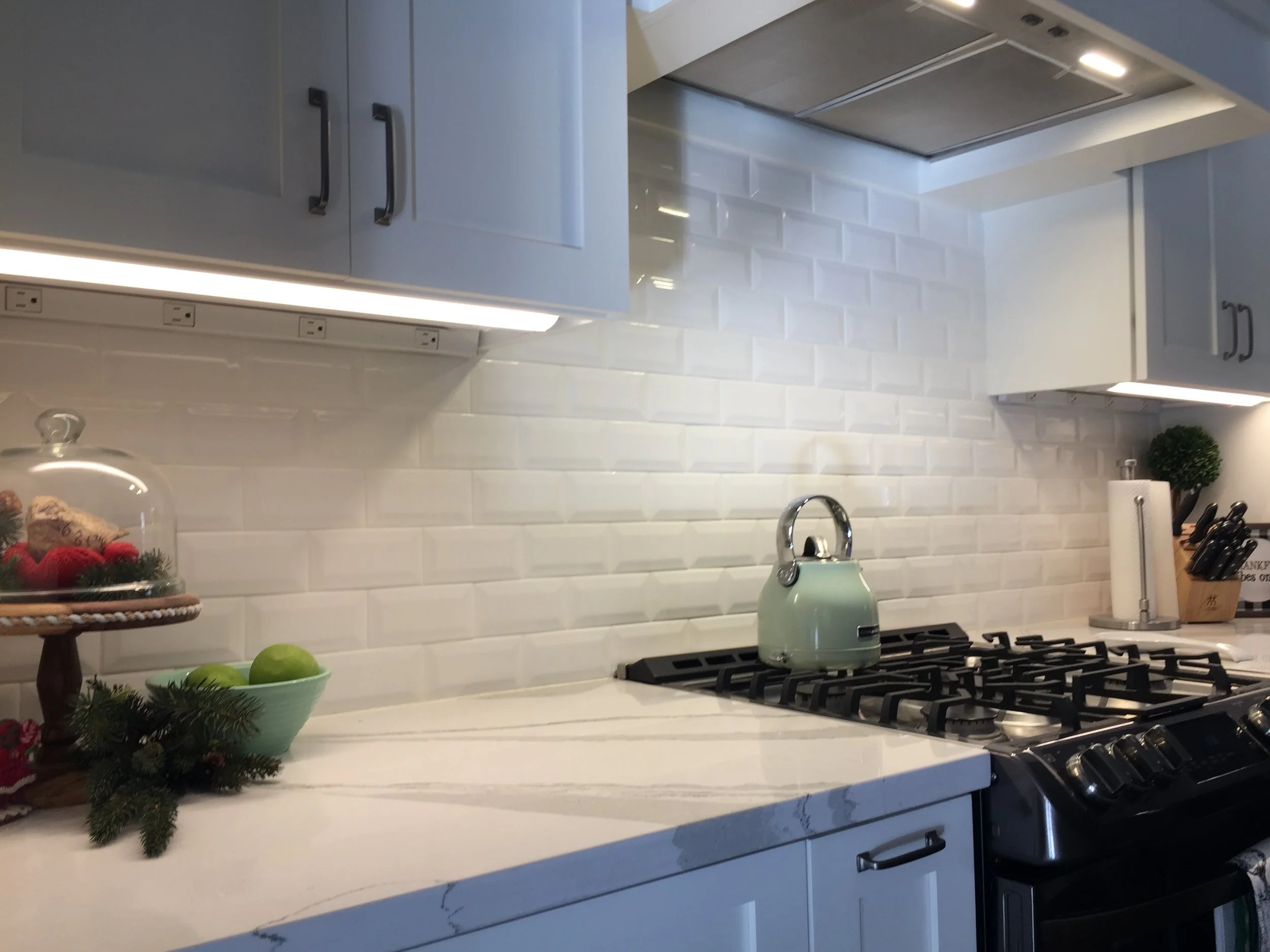Butcher block was added to the island while white Cambria Quartz was installed on the remaining countertops. A farmhouse sink was also added along with a new sink faucet.