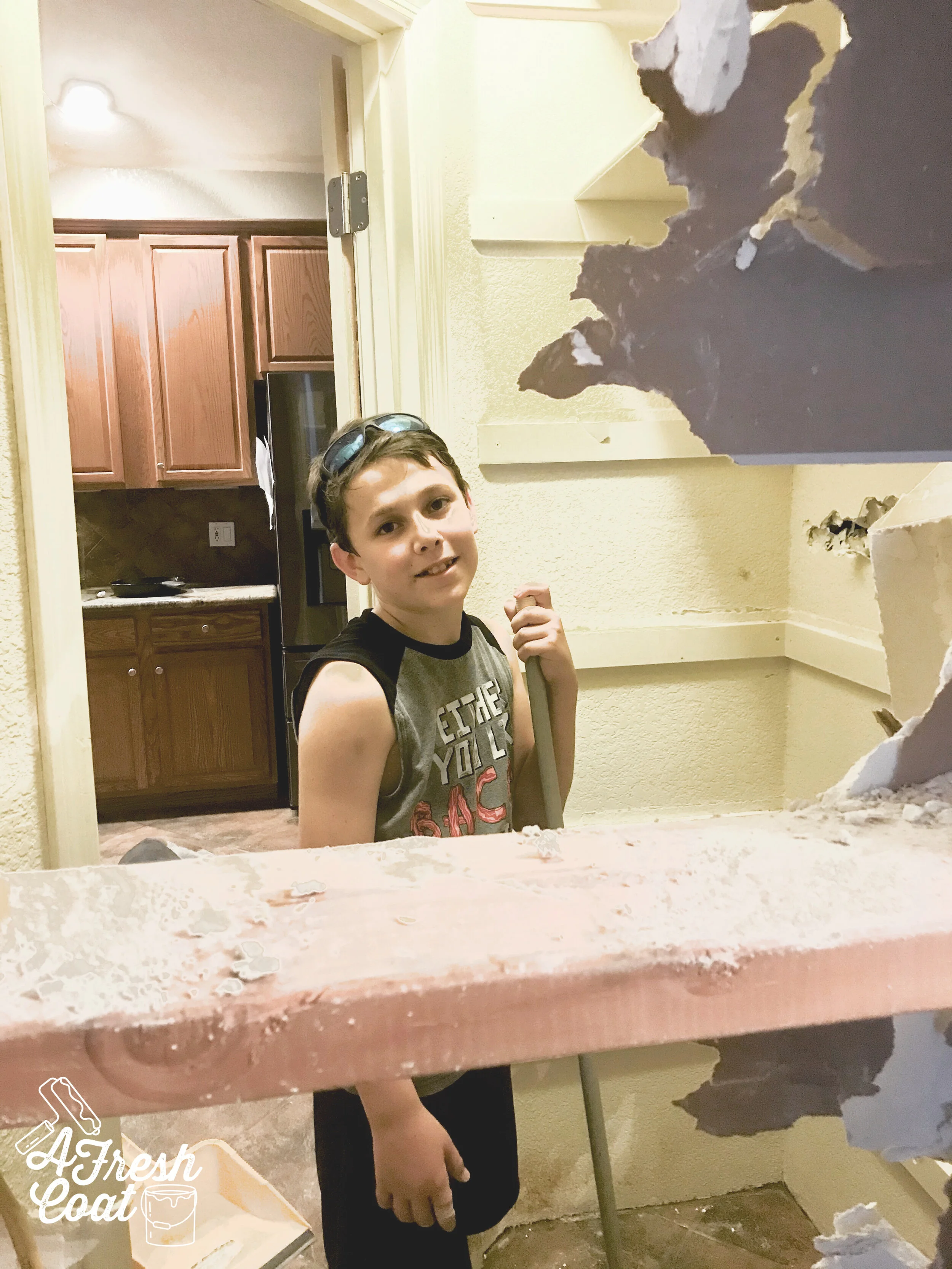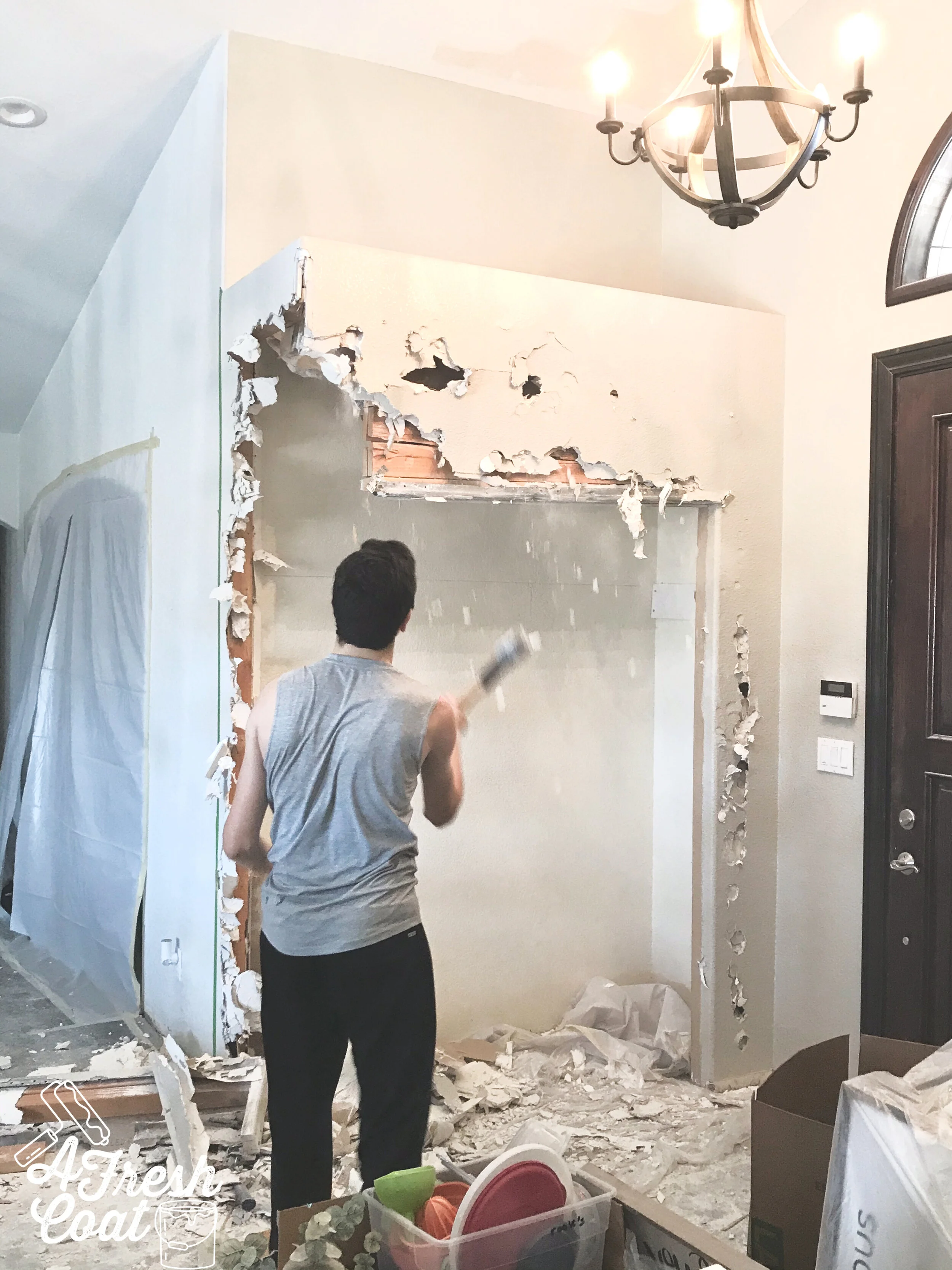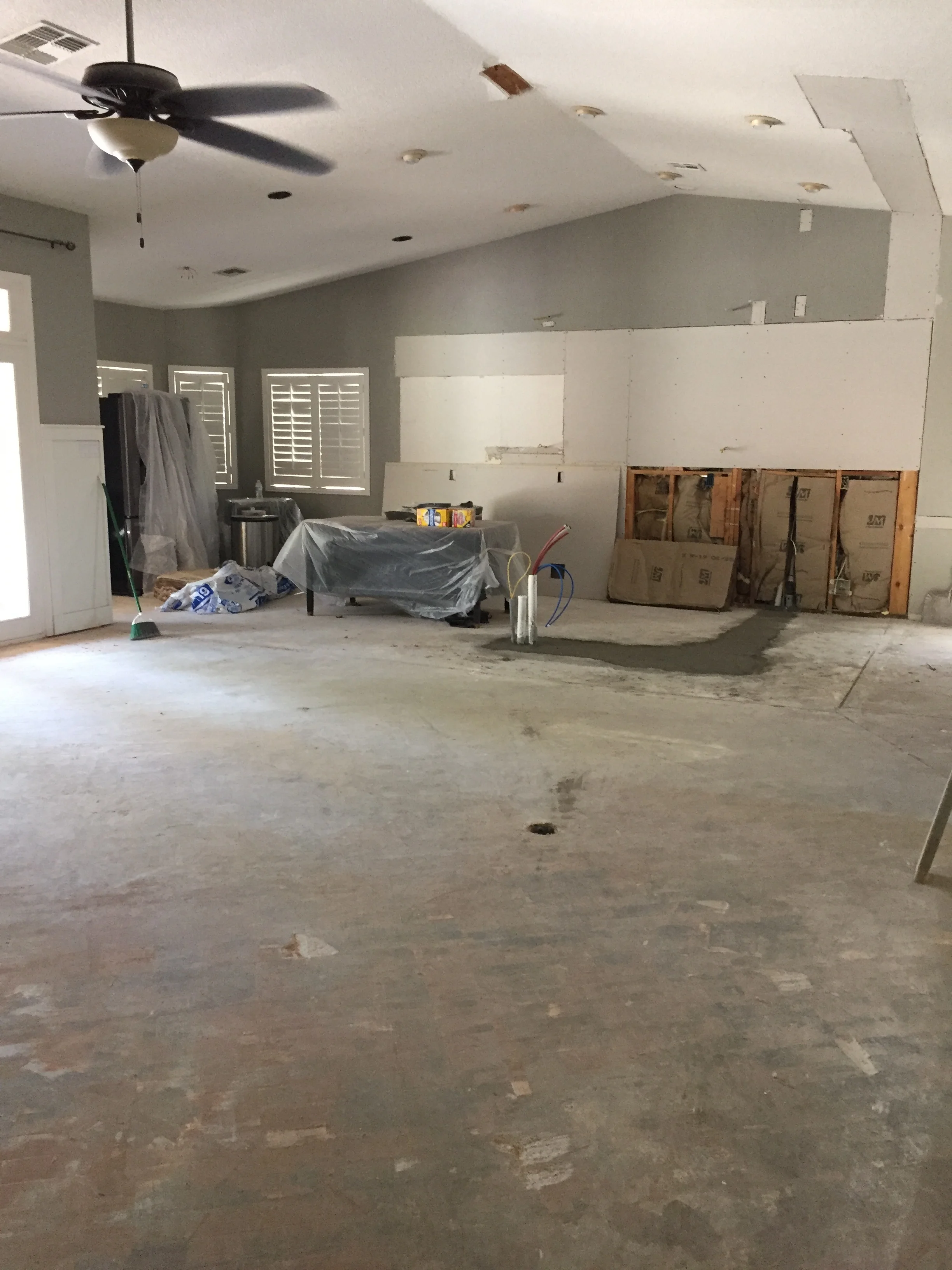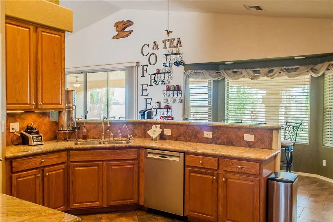 Rust colored accent walls, mixed with a medium tan main wall color, this Southwestern-styled home was about to get a serious makeover. Builder grade oak cabinets along with a southwestern finished fireplace, and laminate countertops were all about to be transformed.