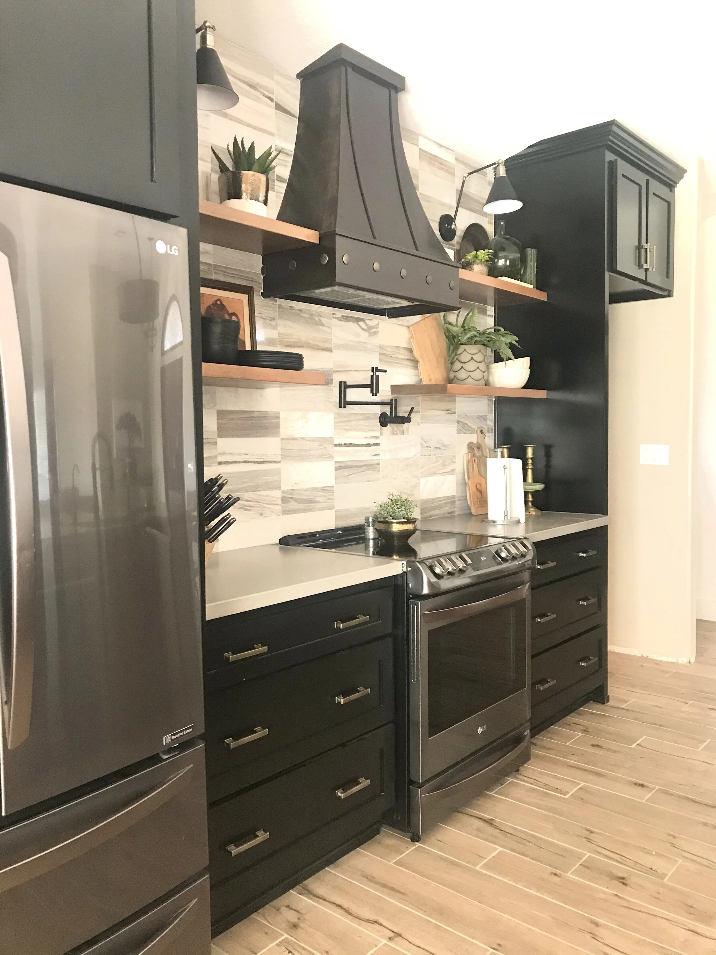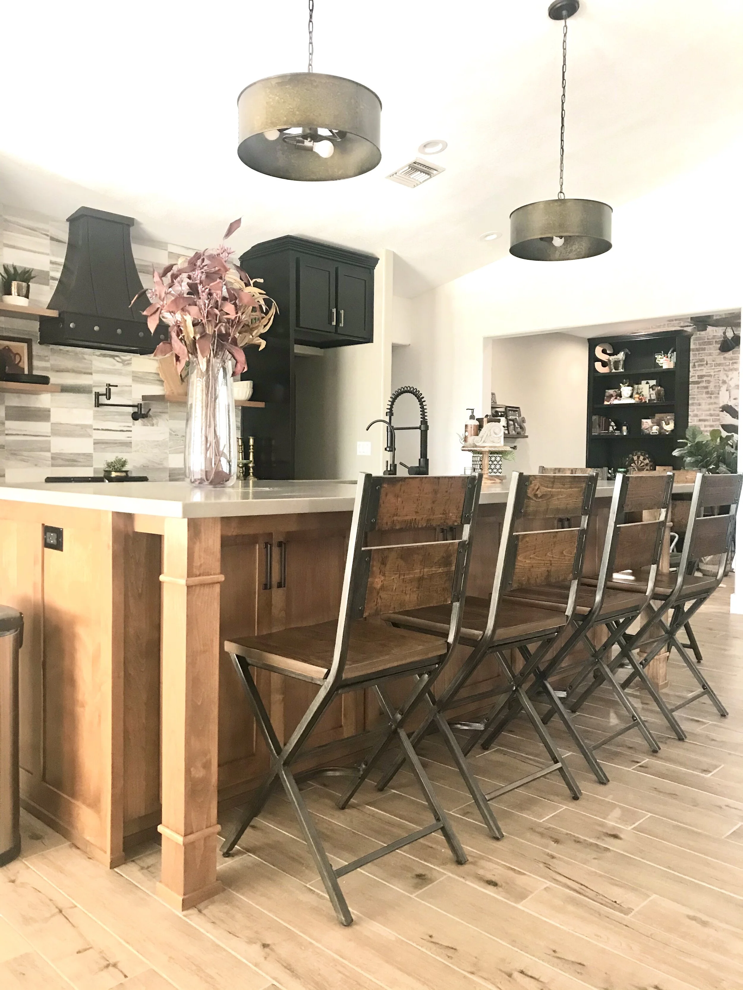 The goal was to bring Southwest elements into a space that would boast deep navy blue cabinetry, contrasting white subway tile, a mix of Cambria white countertops and butcher block, as well as brand new black stainless steel appliances.